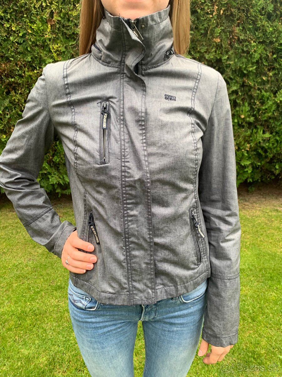 Málo nosená sivo-strieborná ľahká bunda. V límci je skrytá kapucňa.