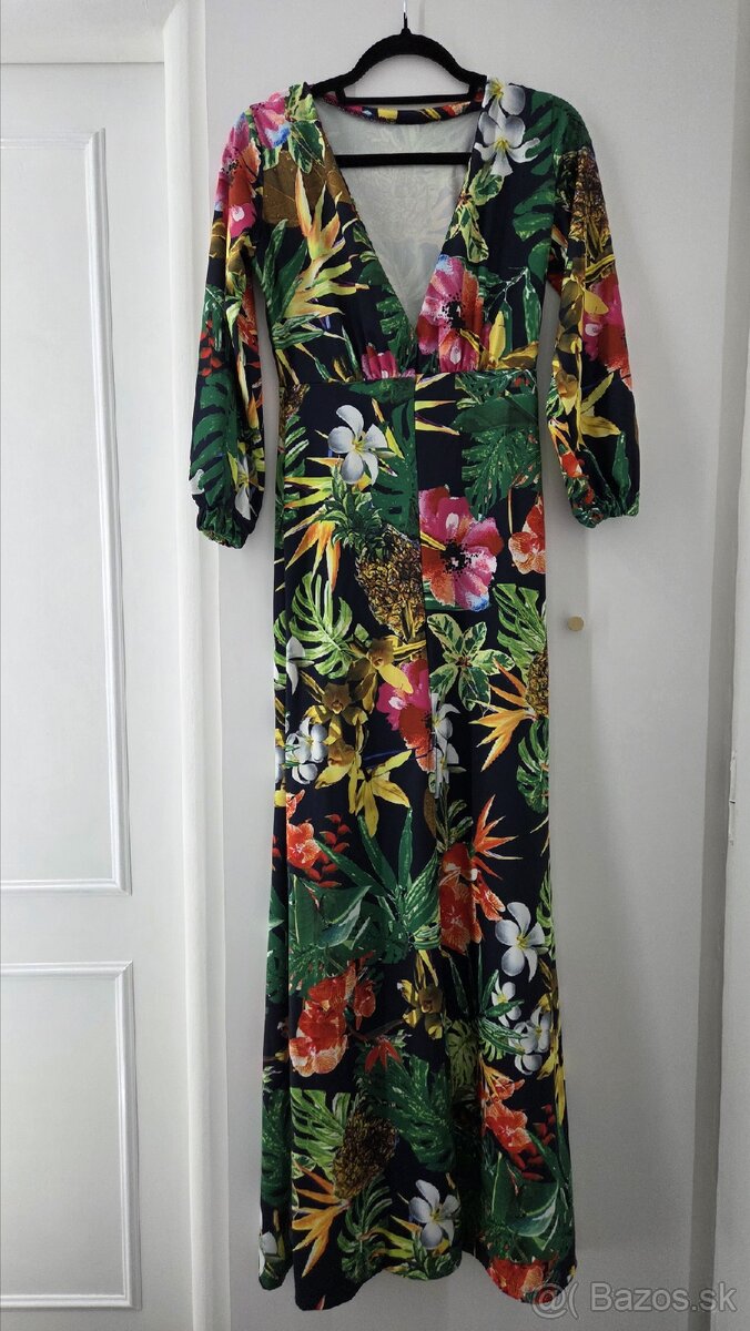 Posuniem 1x oblečené šaty . Krásny letný motiv, vhodne aj na svadbu, oslavy, ale aj len tak do mesta. Veľkosť S. Príjemný materiál, saty majú krásne vykrojeny výstrih do V , rozparok na pohodlnejšie nosenie, . Dlzka šiat je 153cm. Posielam aj na dobierku.