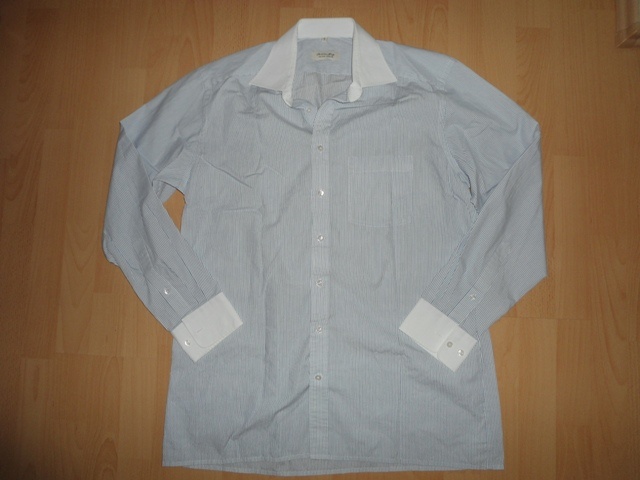 227p. panska kosela - jemny bl.modry pasik, zn. Christian Berg, velk. L, 100% bavlna, nosena, dlzka 81cm, rukav 63cm, rukav od krku 81cm, cez prsia 58x2cm, cez brucho 57x2cm, sirka dolu 60x2cm, sirka rukava hore 22x2cm