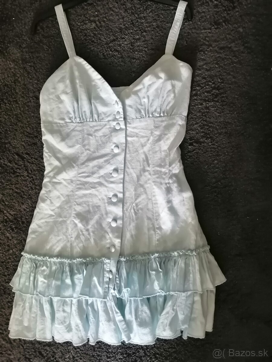 Predám bledomodré melírované bavlnené letné šaty na ramienka s volánmi, veľ. S, vo výbornom stave.