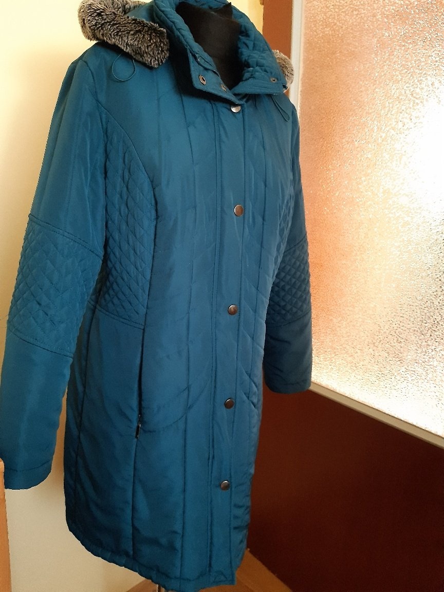 Krásny kabát, značky Paola, udávaná veľkosť je 42. Dl.90 cm, dl.. rukáva60 cm, šírka cez prsia 54X2 cm. Kabát je strednej hrúbky,kabát má aj kapucňu s peknou sivo-čiernou kožušinkou, je v perfektnom stave, bez poškodenia. Nafotená farba skresľuje, v skutočnosti je to tyrysovo-zelená.