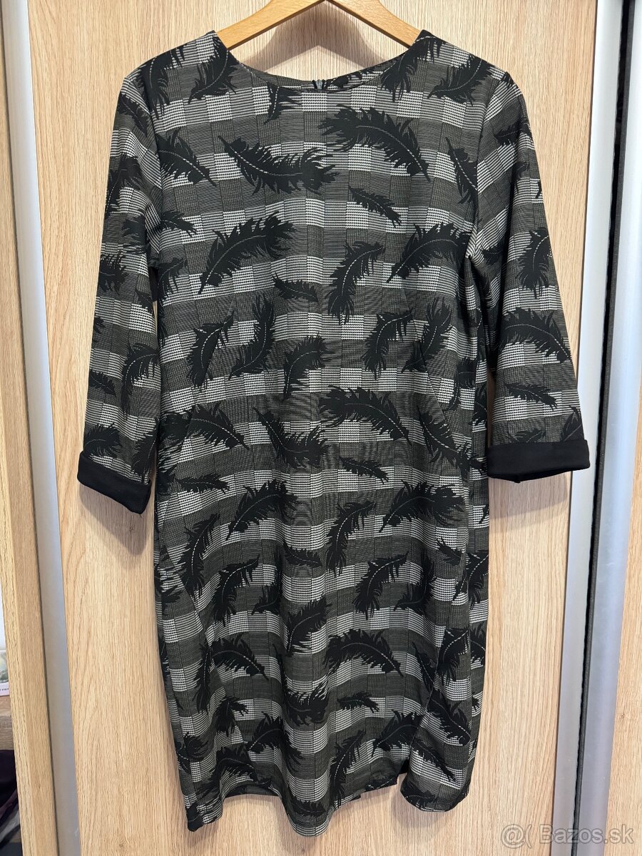 Predám dámske šaty na príležitosť i do práce. Veľkosť uvedená XL, na spodu jemný rozparok cca 2 cm. Rozmery: dĺźka 89, šírka pod pazuchami 50 cm, pás 47 cm, spodok 50 cm