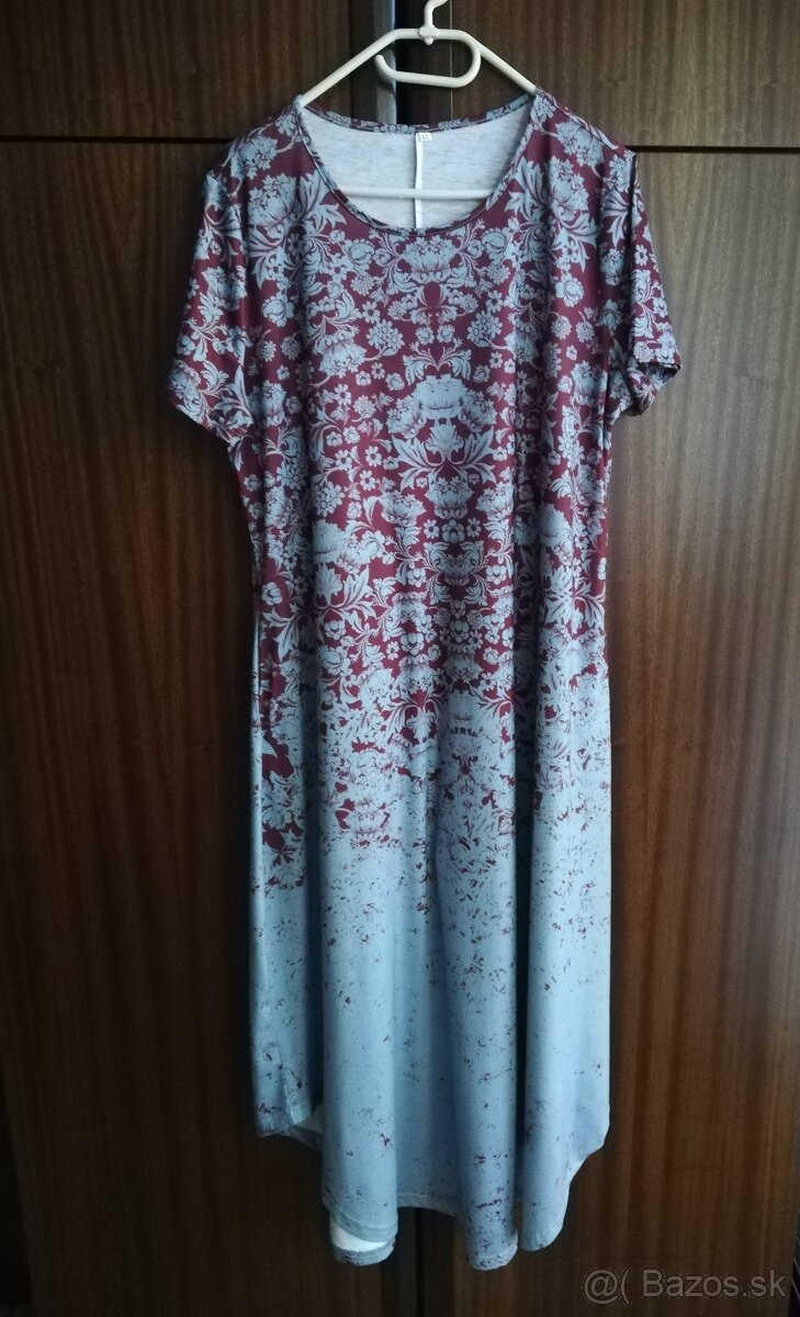 Bordovošedé šaty na jarné obdobie, krátke rukávy, oblúkovité ukončenie, s vačkami, veľkosť XL (šírka v prsiach 54cm, šírka v páse 52 cm) - RAZ OBLEČENÉ, pôvodná