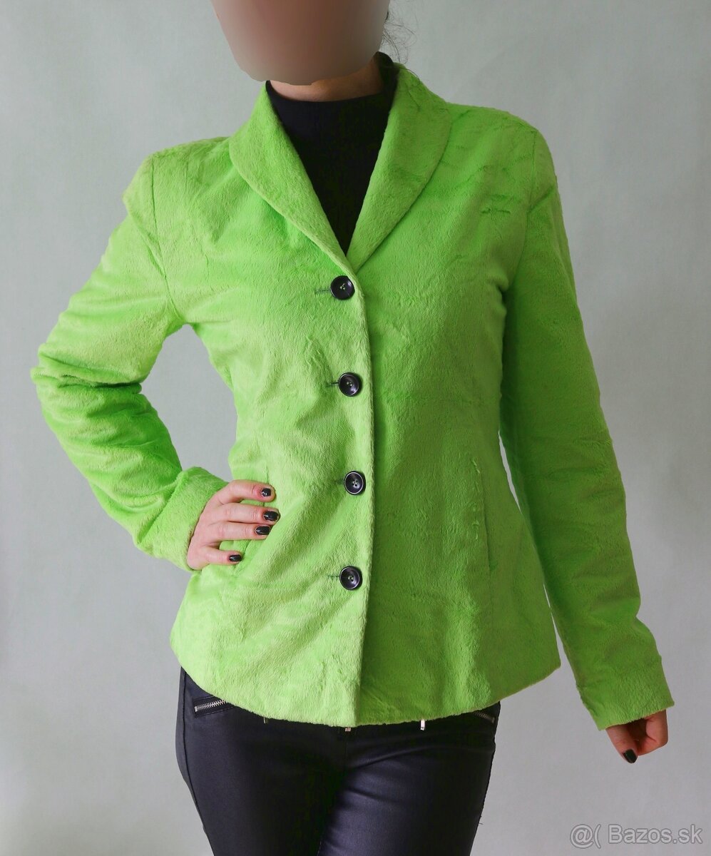 Extravagantné sako zn. Riani od Peter Hahn, z materiálu s nerovnomerným dlhším vlasom, má doslova plyšový vzhľad. Vo svetle sa láme podľa smeru a dĺžky vlákien a tvorí zaujímavé efekty. Strih je klasický, len málo vypasovaný, nad pásom vo švoch vrecká, golier úzky šálový. Farba ostro zelená. Gombíky kontrastné čierne. Sako je podšité. Materiál: 61% bavlna, 39% viskóza, podšívka čierna acetátová. Veľkosť S. Rozmery: ramená 39 cm, prsia 98 cm, pás 90 cm, boky 104 cm, dĺžka saka 65 cm, dĺžka rukáva 61,5 cm. Sako bolo nosené, ale nemá žiadne vady.