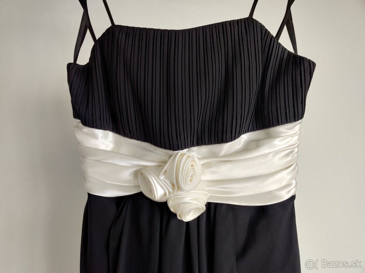 Predám decentné dámske spoločenské šaty z čierneho šifónu s bielym saténovým lemom a tromi saténovými ružičkami pod prsiami. Veľkosť 38. Šaty siahajú pri výške 175 cm po kolená. Majú saténovú spodničku a vpredu aj vzadu ďalšiu vrstvu šifónovej látky strihanú do kosoštvorca, ktorá vytvára zaujímavý efekt. Sú na ramienka, ktoré sa dajú regulovať. Kupované boli v butiku a je k nim aj bolerko značky Orsay z rovnakej látky. Veľmi pekný stav, oblečené boli len dva razy. Odber možný osobne v BA Dlhé diely alebo poštou/Packetou plus poštovné s platbou vopred na účet. Píšte prosím mail, číslo je vymyslené. Ďakujem