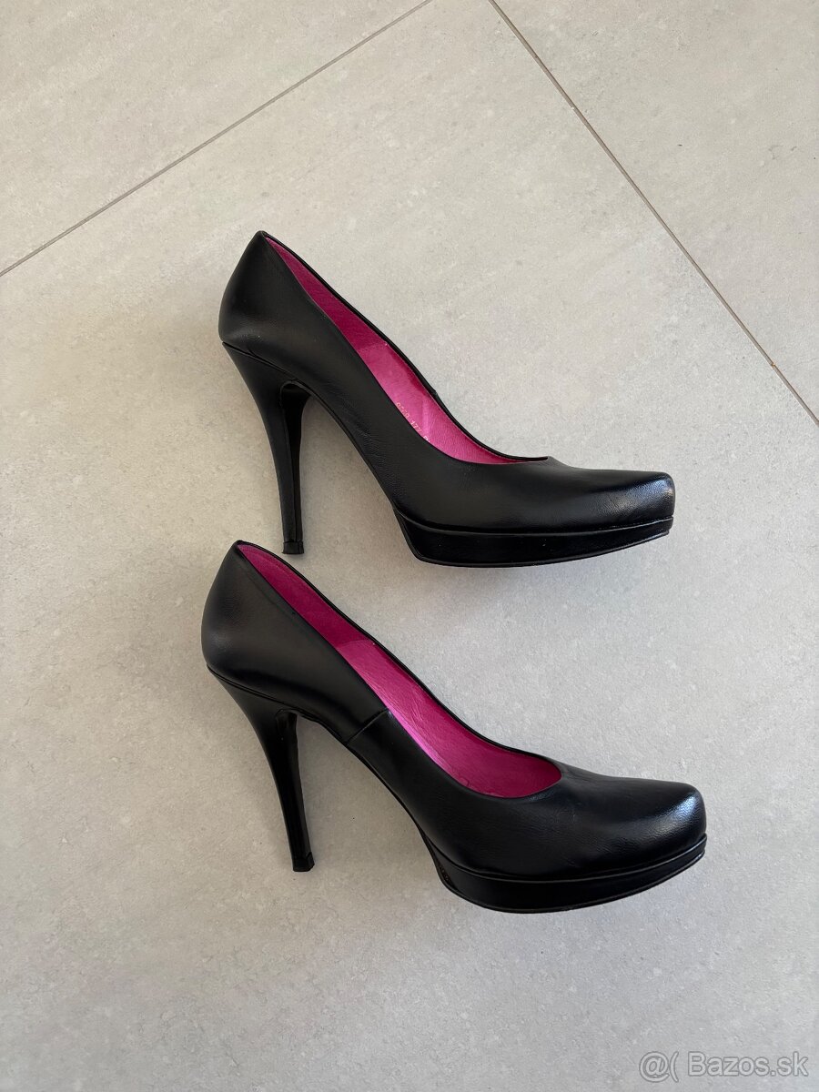 Top stav ako nove, obute asi iba 2x, kozenne, podpatok 9cm ale vdaka platforme pod prstami sa pocitovo zdaju nizsie. Velkost 40.