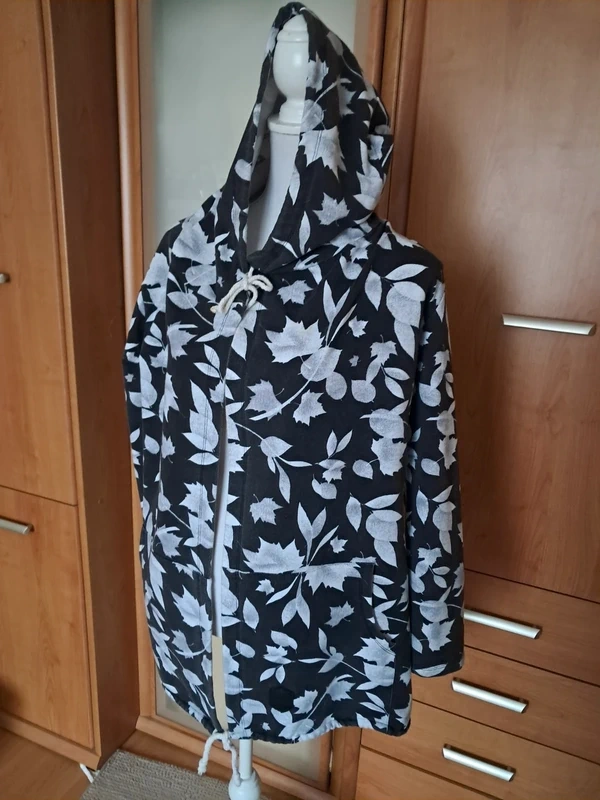 čierno-biela mikina so zapínaním na šnúrky hore z kapuce a dole. Kapuca je napevno, materiál je mäkučký, lahký. Vpredu sú 2 hlboké vrecká. Zloženie je 70 % bavlna, 5% Spandex 25 % polyester. , značka : Free Styll. Univerzálna veľkosť.Cena 9 eur