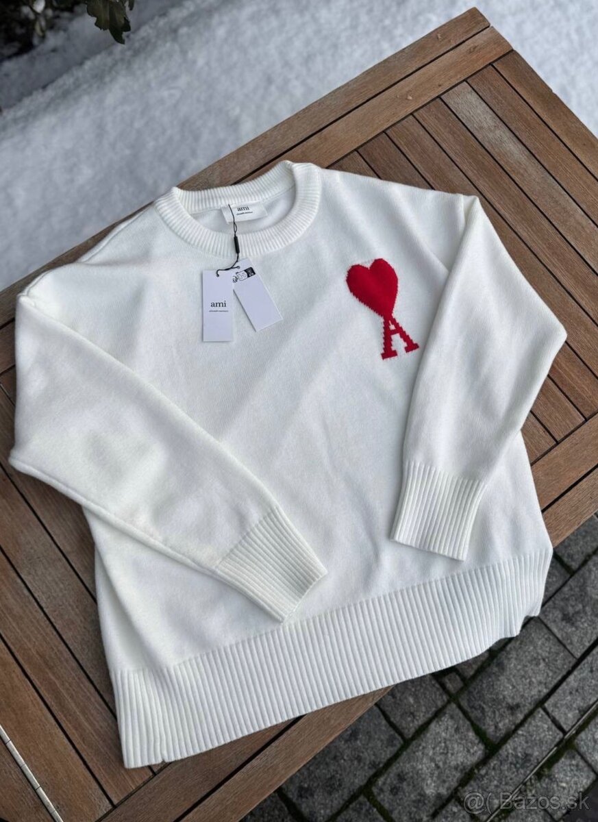 Predám tento štýlový biely sveter od prestížnej značky Ami Paris. Je to nadčasový kúsok s ikonickým červeným logom "A" so srdcom (Ami de Coeur), ktorý sa perfektne hodí do každého minimalistického šatníka. Sveter je vyrobený z veľmi príjemného a kvalitného materiálu.