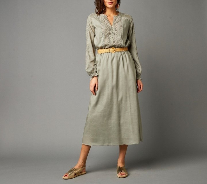 Pokiaľ túžite po ženskom štýle, zvoľte dlhé šaty zdobené macramé a anglickou výšivkou. Lichotivá dĺžka a jemná farba, ktorá sa ľahko kombinuje. Z textúrovaného materiálu. Okrúhly výstrih s prámikom a macramé nariasením. Vpredu macramé náprsenka s gombíkovou légou až po pás. Pružný prestrih v páse vytvorí priliehavosť. Dlhé rukávy, po celej dĺžke a na pleciach s macramé pruhom. Rozšírený spodný lem. Podšívka trupu až po kolená. Možno prať v práčke.