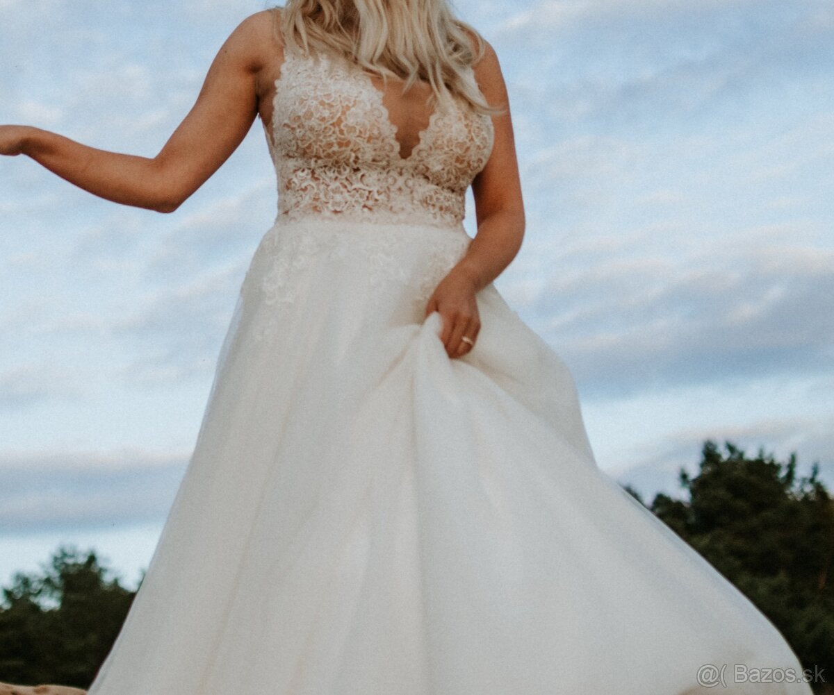 Svadobné šaty - [28.2. 2026]Predám moje nádherné, pohodlné svadobné šaty nastávajúcej neveste. Som prvom majiteľkou, veľkosť by sadla tak na S/M, upravené na útlejšiu postavu s výškou cca 160 cm + cca 5cm opätok. Vzadu sú elegantné gombíky a šnurovačka. Šaty sú ľahučké, moderné a osobne som sa v nich cítila veľmi pohodlné. K š ...