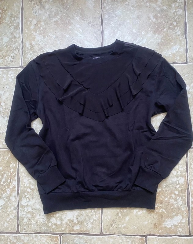 Čierna mikina s transparentným detailom a volánom vpredu Reserved, veľkosť S, aj sedí. Nosená, bez poškodení.