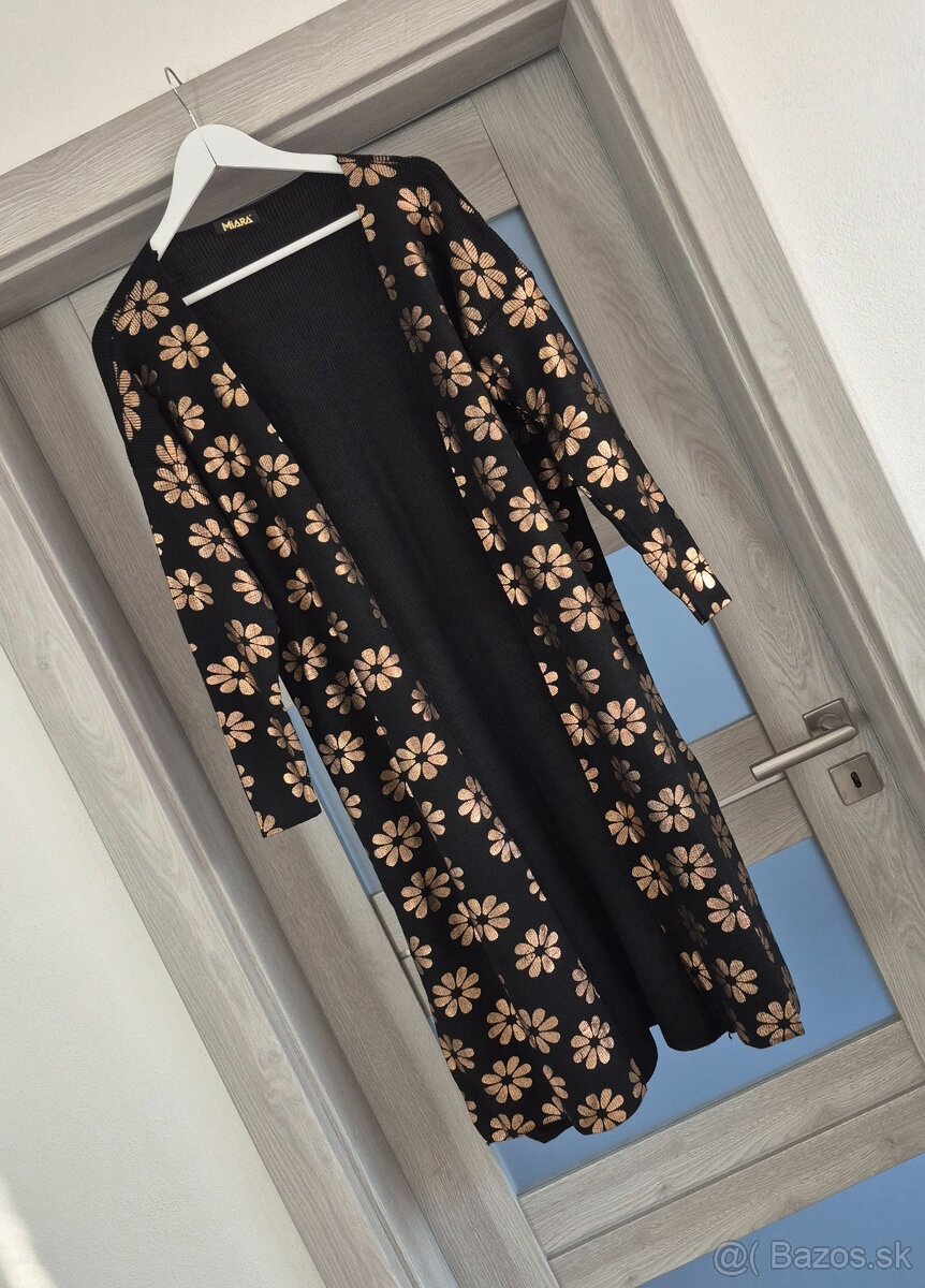 Čierny úpletový kardigán so zlatými kvetmi, d.112cm, vhodné na v.M/L/XL, 70% akryl, 30% bavlna, stredne hrubý úplet, elastický, nový s visačkou, bočné rázporky, 29€+poštovné.