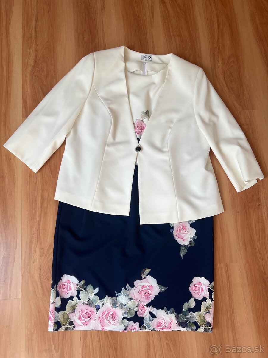 Krásne šaty na slávnostné udalosti. Vhodné aj pre svadobnú mamu. Kombinácia bielej a modrej doplnená a ruže. Na chrbte sa zapínajú na zips a sako vpredu na gombík. Oblečené boli len raz. Veľkosť 52.