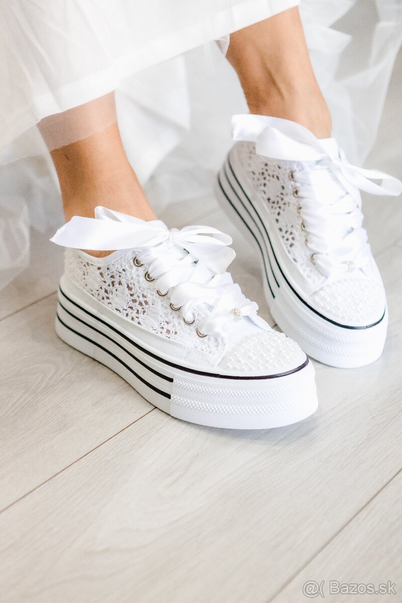 Svadobné tenisky na platforme. Čipkované, ručne zdobené. Nové. Veľkosť 37. Aj iné veľkosti, v prípade záujmu ma kontaktuj.