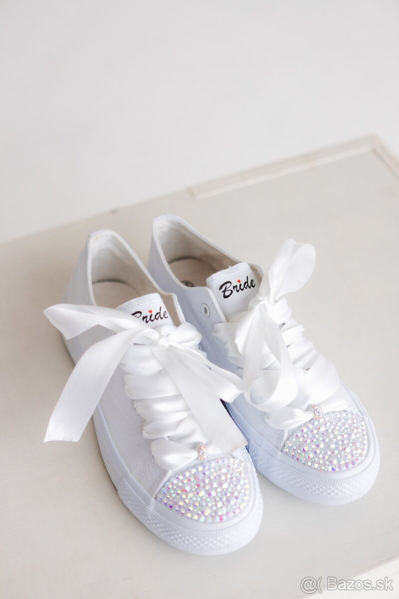 Svadobné tenisky Crystal, veľkosť 37 - [5.1. 2026]Žiarivé svadobné pohodlné tenisky nie len na svadbu:) Ručne zdobené krásnymi kamienkami, saténové šnúrky s ozdobnými krúžkami. Obľúbené u neviest ako popolnočné alebo aj celosvadbové nakoľko sú pohodlné, štýlové a elegantné. Využiješ aj na iné príležitosti. Veľkosť 37 – 23,5 cm.
