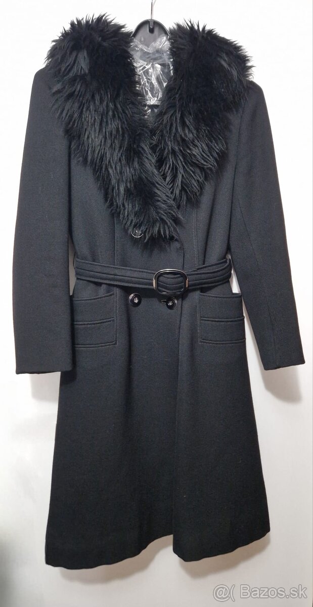 Dámsky kabát čierny č.40 - [27.2. 2026]Ponúkam elegantný, nekrčivý, zateplený čierny kabát s kožušinovým golierom, dovoz z Rakúska. Krásne ušitý 80% bavlna. Dĺžka 118cm, rukáv 60cm, obv. hrudníka 112cm a obv. bokov 124cm.