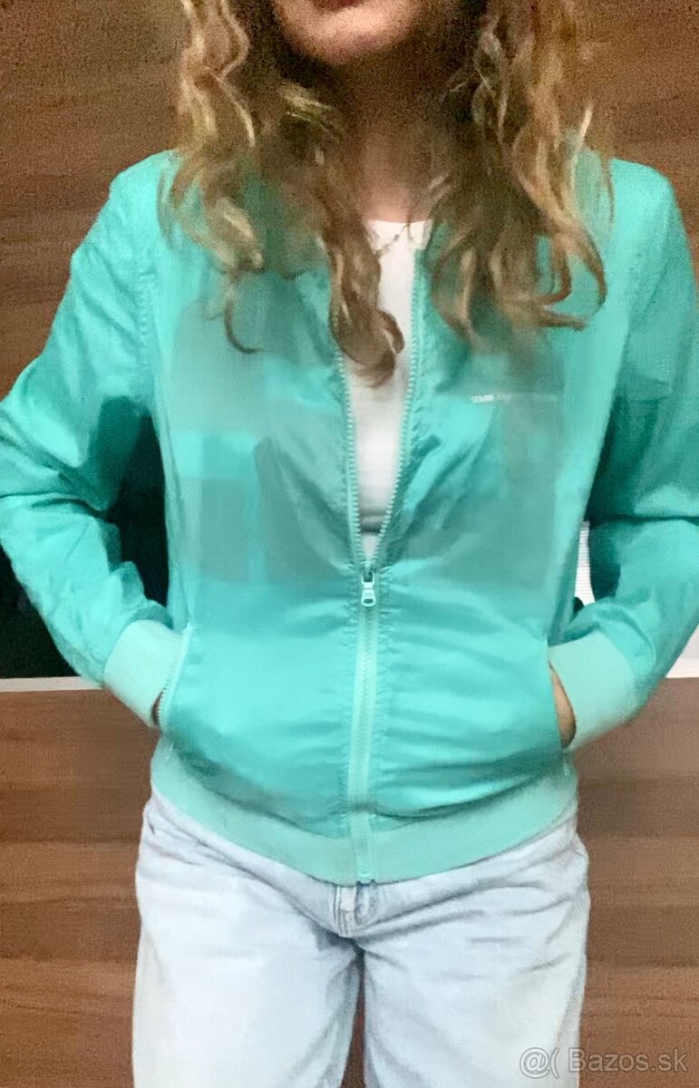 Dámska tyrkysová bunda- bomber bundička Semir Jeans s odopínacou kapucňou. Uvedená veľkosť L, ale reálne S. Nenosená. Pôvodná cena 49 eur