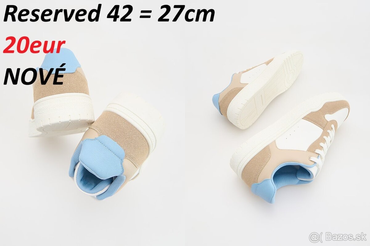 Panske tenisky RESERVED - [20.2. 2026]Predam panske tenisky, znacka RESERVED, kupovane v BA za 45 eur. Stav velmi dobry, obute max 5-krat, ziadne chyby, uz nie su vyuzivane. Velkost 43. Pri vaznom zaujme poslem lepsie fotky a pri rychlom jednani je mozna zlava, piste na mail.
