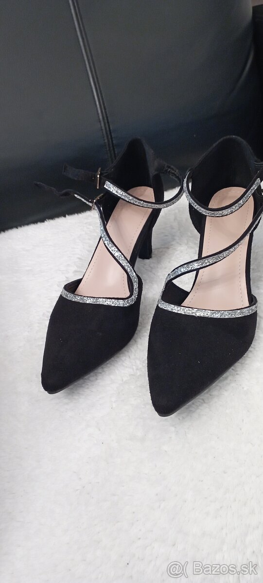 Predam nové dámske lodičky, len vyskúšané, veľkosť 40, dĺžka vnútorná 26cm, výška opätku 7cm, materiál textil-semiš, čierne po obvode flitre.