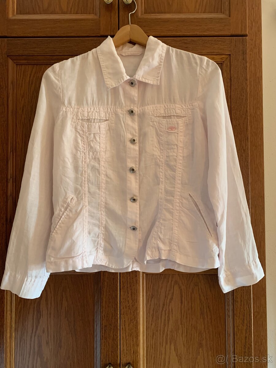 Dámska ľanová košeľa, 100% ľan, značka Tom Tailor, veľkosť M, jemná púdrovo-ružová farba, na boku vrecká, zadná dĺžka 61cm, šírka v podpazuší 48cm, vnút.dĺžka rukávu 44,5cm, vonk.dĺžka rukávu 60cm, šírka pliec 38cm.