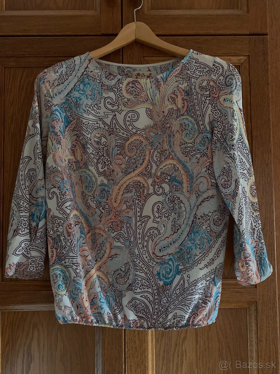 Dámska blúzka, vynikajúci stav, veľkosť 38, kašmírový vzor, 3/4 rukáv, veľmi príjemný jemný viskózový materiál, v spodnej časti a na rukávoch je jemná gumička.
