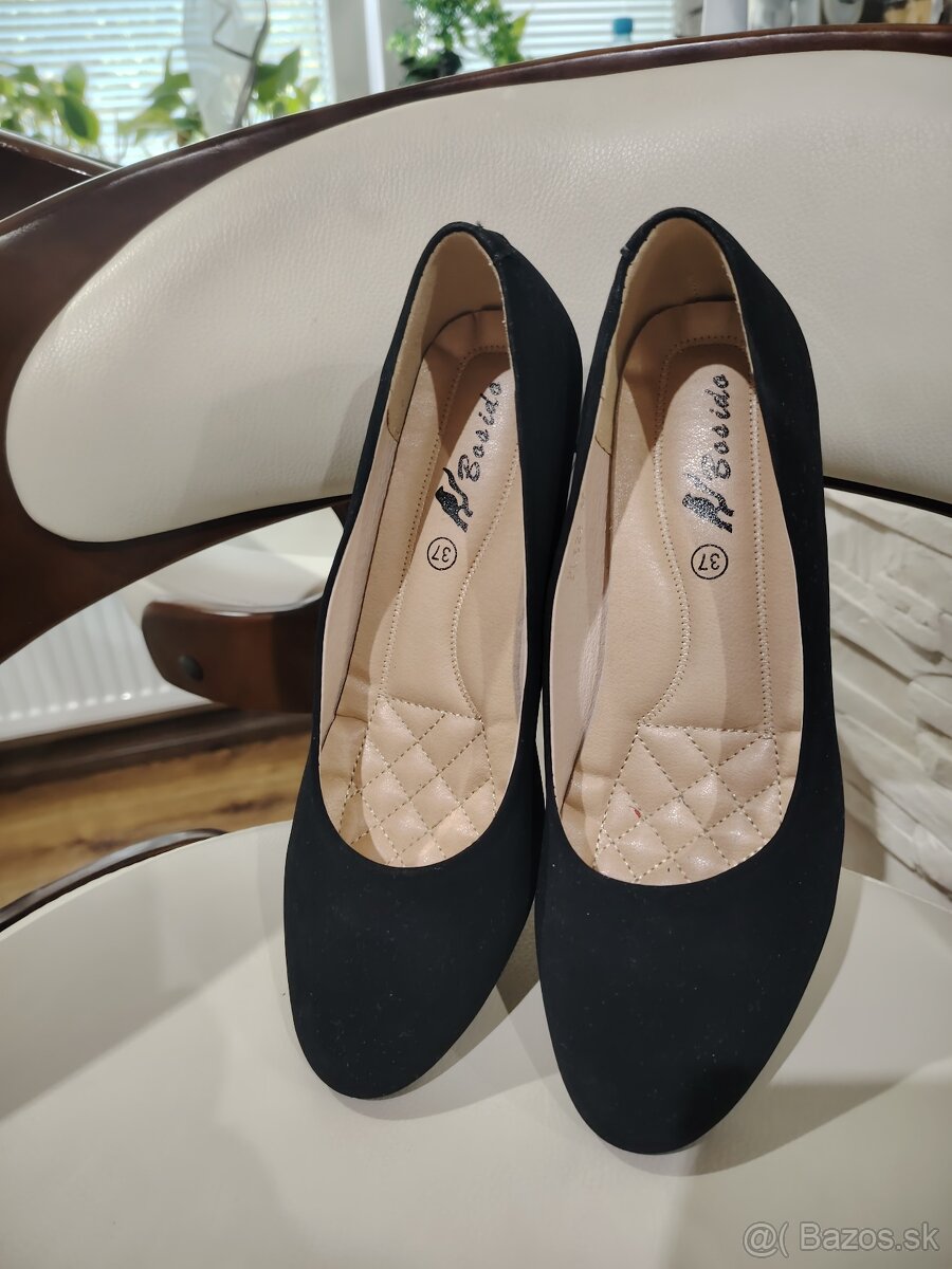 Lodičky veľ. 36 - [4.3. 2026]Predám lodičky 1x na chvíľu obuté, čiernej farby, veľkosť 36, výborné na bežné chodenie, k topánkam sú náhradné opätky. Na klenbe i zospodu chodidla vystužené, mäkké /viď. detail/. Len mi stoja v skrini.