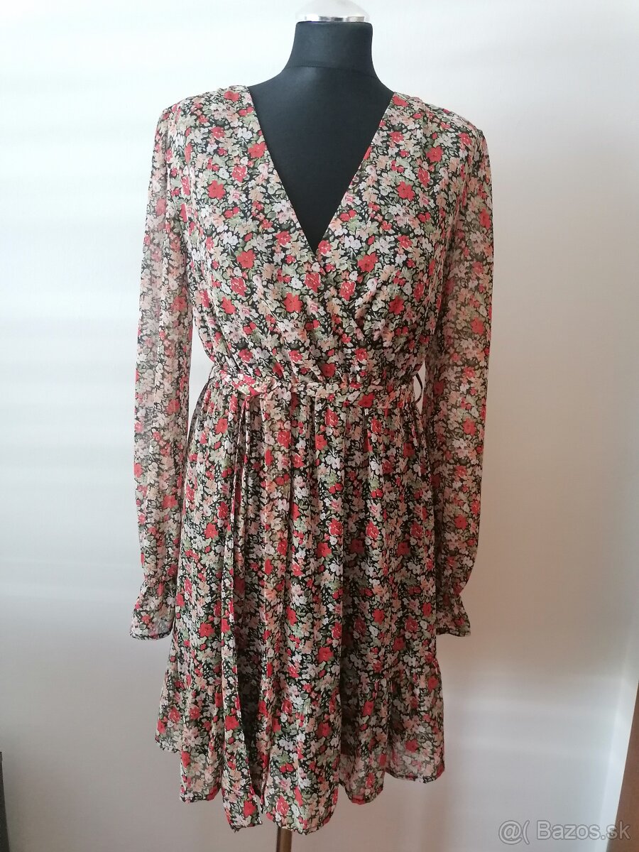 Dámske kvetované čierne šaty HM - [2.3. 2026]Dámske čierne kvetované šaty s volánom na spodku. Výstrih do V, na chrbte pri krku na zaväzovanie na šnúrku. Šaty sú z tenkého príjemného materiálu a sú podšité látkou- okrem rukávov. Dĺžka pri výške 170 cm nad koleno. Šaty majú pohodlný rovný strih.