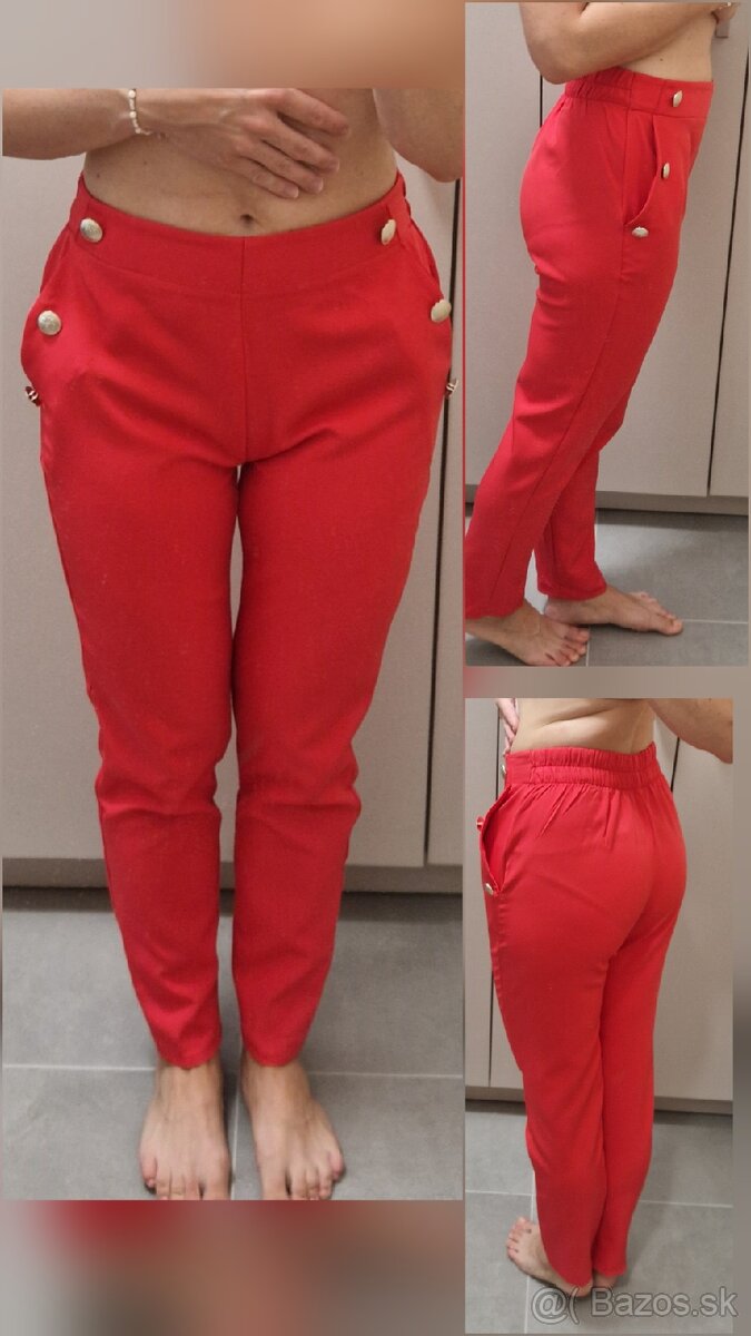 červené elegantné nohavice, bez zipsu, vzadu gumička, na bokoch "zlaté" gombíky, veľkosť S-M, na užšie boky