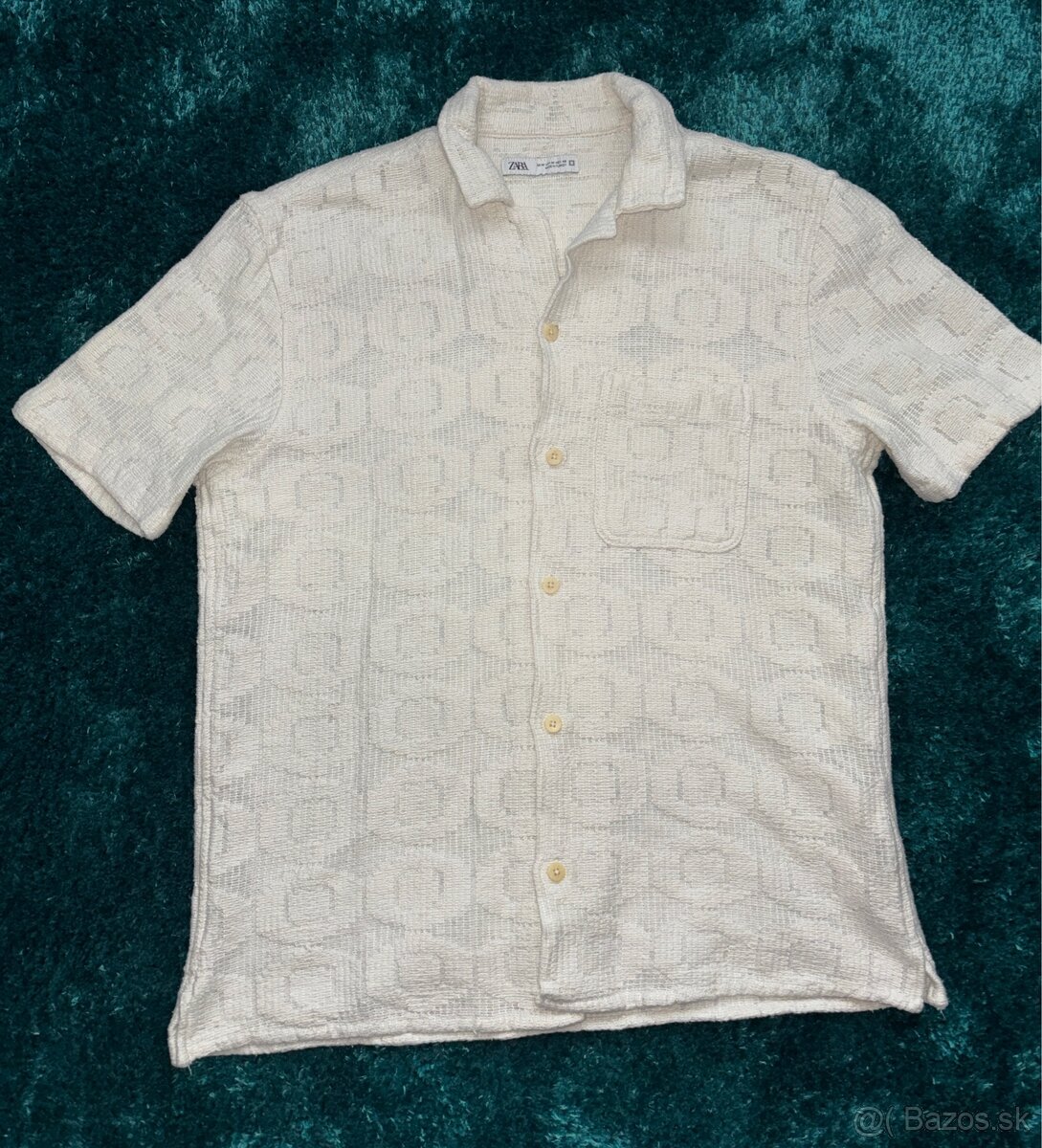 Zara košeľa s krátkym rukávom z textúrovaného béžového materiálu. Má zapínanie na gombíky a jedno náprsné vrecko.