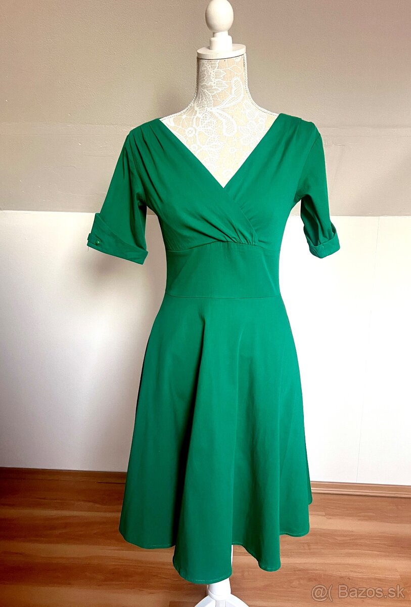Zelené šaty z príjemného materiálu. Zapínajú sa vzadu na zips, takže sa jednoducho obliekajú. Sú elegantné a výrazné nielen farbou, ale aj strihom. Písaná je veľkosť S, podľa mier sú skôr 38.