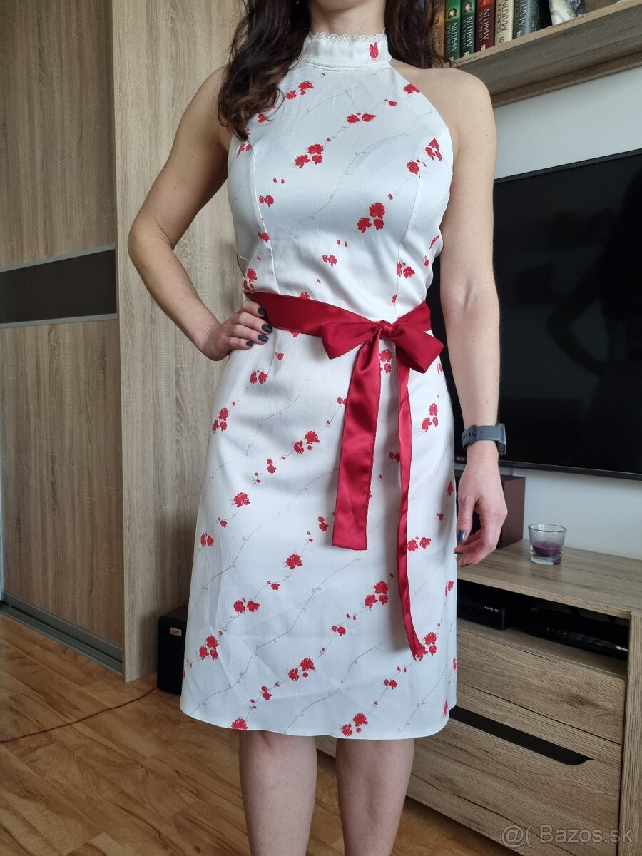 Predam spolocenske saty jemne kremovej farby s viazanim okolo krku a chrbta. Bordova masla je odnimatelna a da sa nastavit podla toho ako sa vam to paci alebo ju nemat vobec. Uvedena velkost je 40 ale sedi aj na 38. Su mierne elasticke.