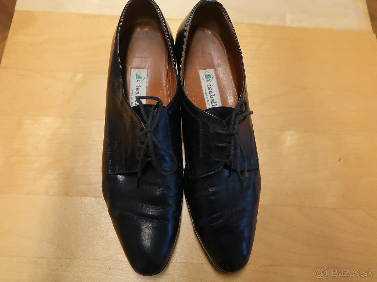 Ponúkam na predaj dámske talianske šnurovacie poltopánky veľkosť 42. Topánky sú farby tmavomodrej, sú vyrobené z veľmi jemnej, mäkkej kože. Majú koženú aj stielku. Výška podpätku: 4 cm. Sú vo veľmi dobrom stave.