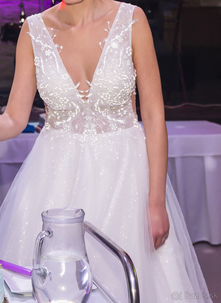 Predám raz oblečené svadobné šaty. Šaty sú podhnuté na výšku 173 cm + 5 cm opätok, sú však vhodné aj na vyššiu postavu. Výstrih šiat som mala upravený, úpravy na šatách boli robené tak, aby sa dali vrátiť do pôvodného stavu, úpravy ma vyšli 25 eur. Veľkosť cca 36. Šaty majú kratšiu vlečku, ktorá sa dá vypnúť. Pod šatami som mala menší kruh (požičaný).