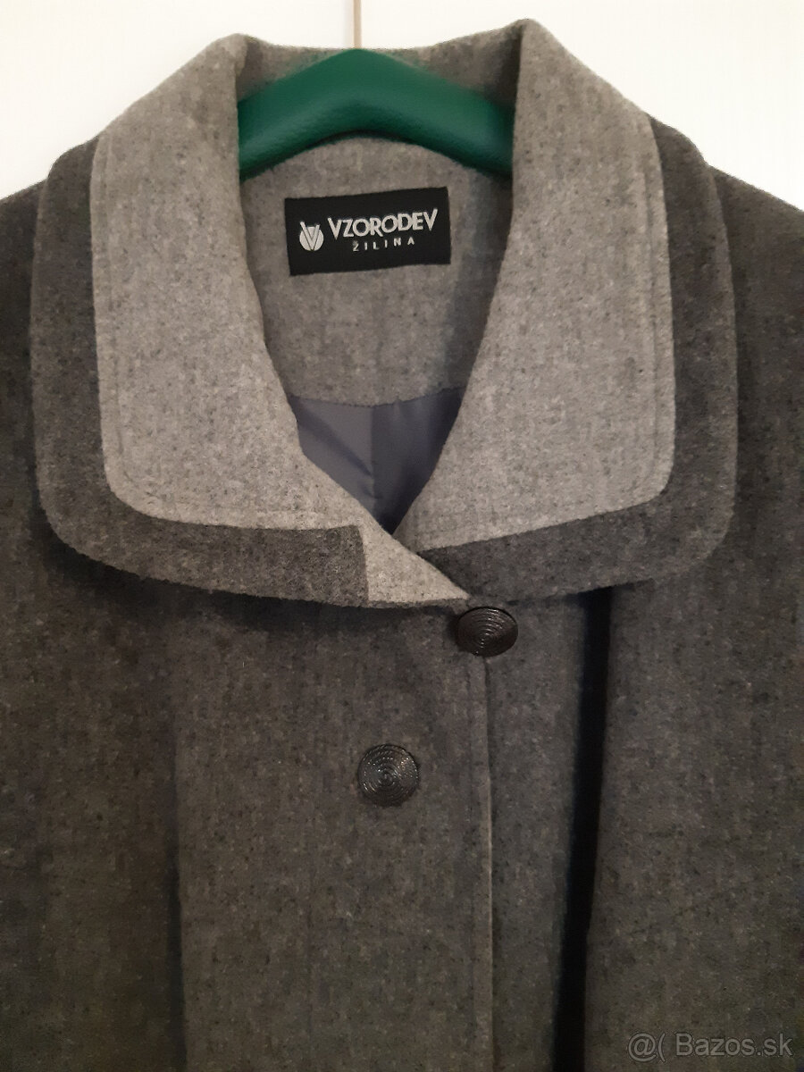 Ponúkam nenosený tmavošedý flaušový kabát, skryté zapínanie, vzadu rozparok 45cm, veľkosť č.50,na postavu výšky 175cm. Zloženie 85% vlna a 15% polyester. Šírka ramien 50cm, dl. rukávov 64cm, obv. hrudníka 132cm, obvod bokov 138cm a dĺžka kabáta 130cm.Slovenský výrobok, pekne ušitý.