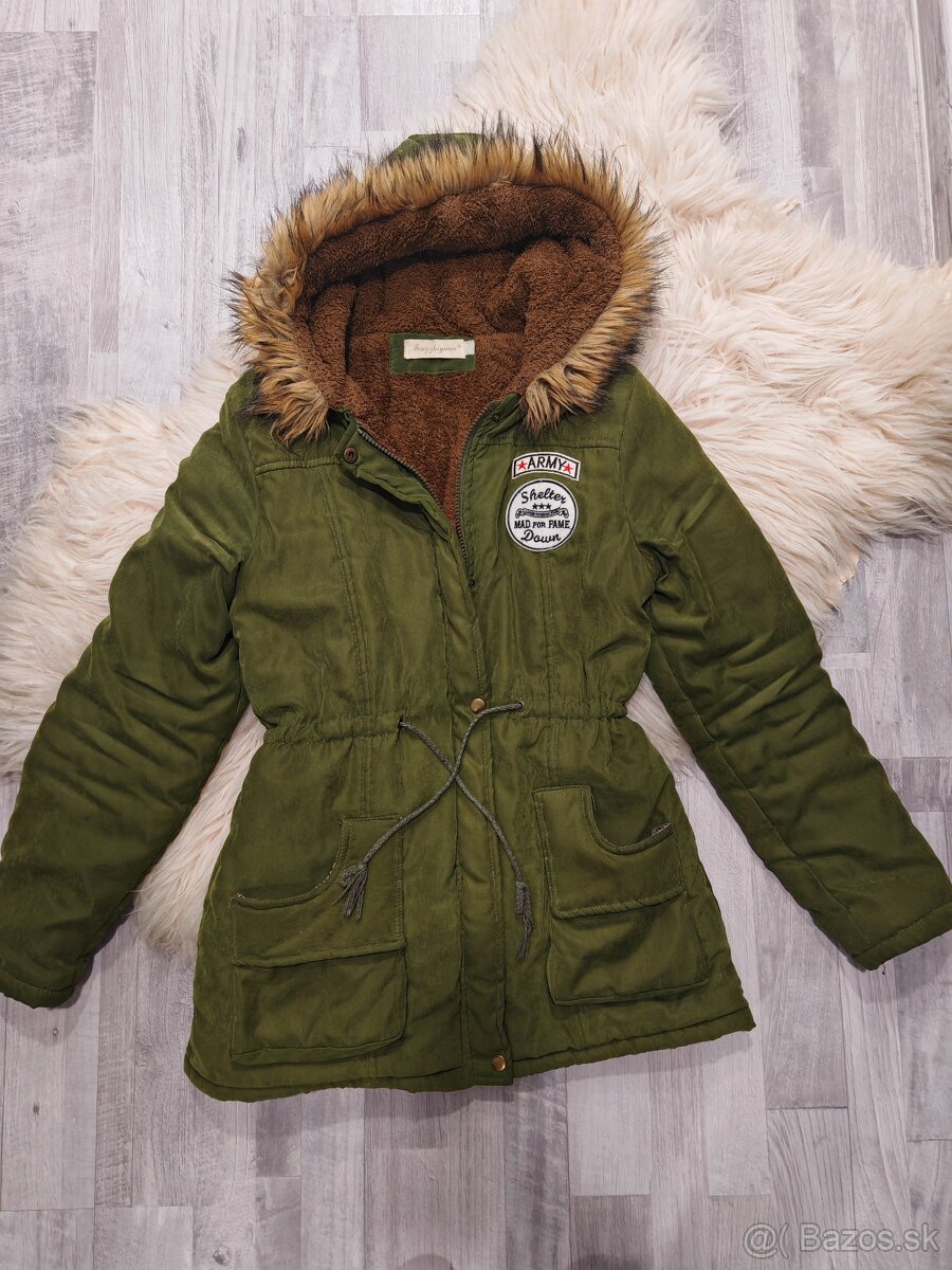 Teplá zimná bunda zelenej army farby, kapucňa s kožušinkou, nosena veľmi málo, bez poškodenia, pás regulovatelny, rozmery dĺžka rukáva od ramena 61cm, prsia 2x49cm, celková dĺžka 71cm. Cena 10 EUR + POŠTOVNÉ. Kontakt cez email. Tč vymyslené.