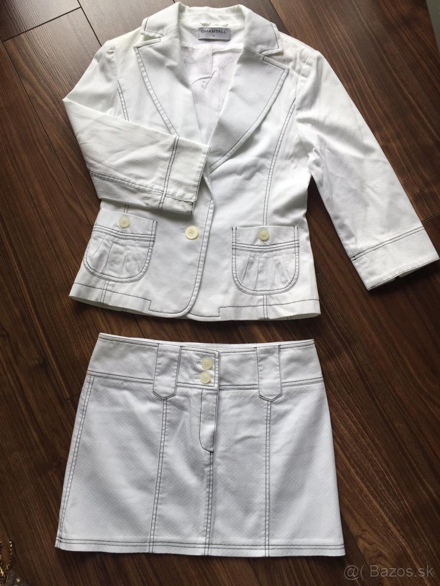 Predám Sukňový biely kostým Chantall, rozmer 34, čiernou nitkou preštepovaný, bez známok nosenia. Materiál: bavlna a elastan. Rozmery: sako v prsiach: 39-40 cm, dlžka saka: 58 cm, sukňa v páse:36-37 cm, dlžka sukne: 32 cm, cena 30€ + poštovné, možný odber v BA