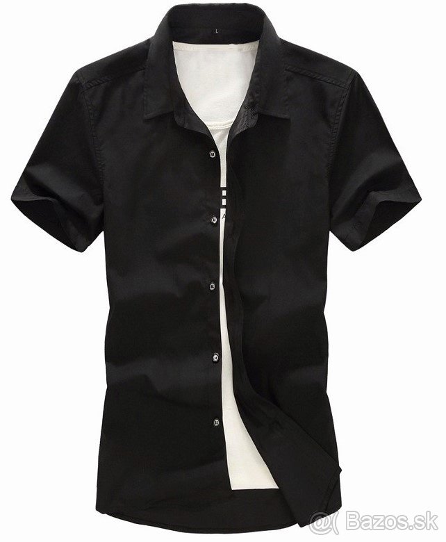 Nová pánska košeľa s krátkym rukávom. Krásna čierna farba. Príjemný a kvalitný materiál (spandex a bavlna). Na bežné nosenie aj na slávnostnejšiu príležitosť. Veľkosť: XL. Rozmery: ramená 50 cm, hrudník 55 cm, rukáv od ramena 22 cm, šírka rukáva 21 cm, celková dĺžka 74 cm. Dobierka nie, iba platba vopred.