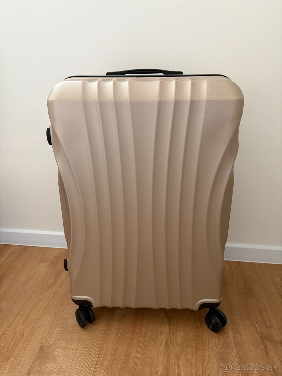 Predám cestovný kufor – na kolieskach, veľký, škrupinový, objem 98 l, rozmery 75 × 50 × 30 cm (V׊×H), upínacie pásy a vnútorná deliaca priehradka, 4 otočné a zdvojené kolieska, zapínanie dvojcestným zipsom, TSA zámok, teleskopické, bočné a horné držadlo, béžová farba, jednofarebný motív, hmotnosť 3,9 kg,
