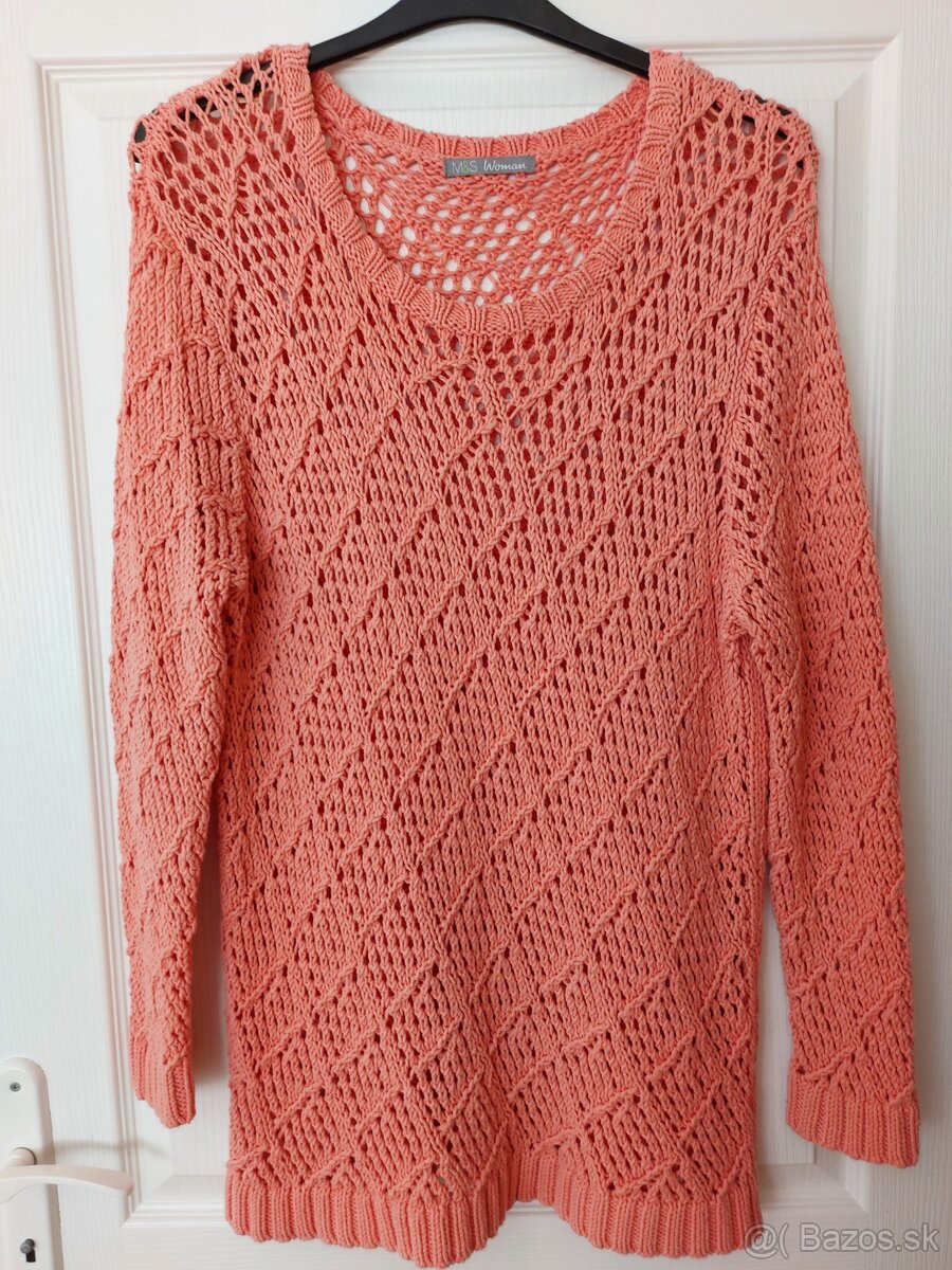 Dámsky sveter - [14.3. 2026]Predám dámsky dlhý sveter značka M&S, veľ. 44-46,L, kvalitný, príjemný, mäkký prispôsobivý pulóver vhodný aj ako oversize, voľný úplet. Broskyňová, lososová farba, svetlá korálová. + poštovné
