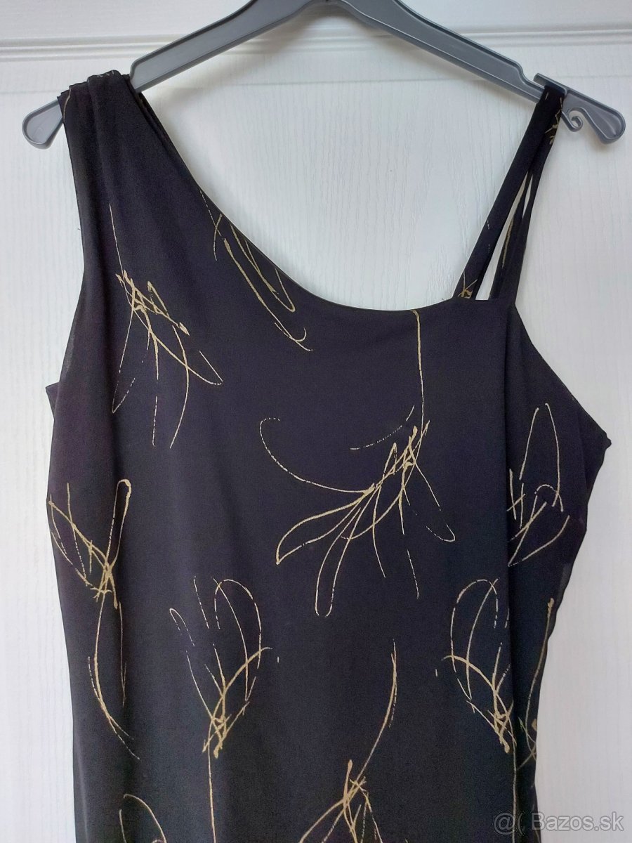 Predám dámske šaty čierne so zlatým vzorom, ľahký padavý materiál šifón, futrované, podšité cca do polky stehien, dlhé 145cm, rozparok na pravej strane, značka Carlo Cecci, uvedená veľkosť 44, sedí skôr na 42/44 vhodne na spoločenské udalosti, ples, Vianoce silvester, svadba, využitie aj v lete. Vyrobené na Slovensku. 19 Eur + poštovné