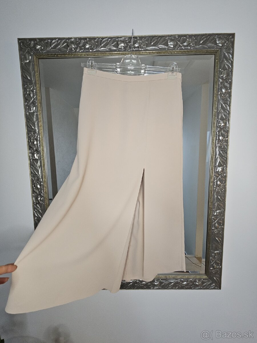 Krásne béžové nohavice COS. Nohavice sú rafinovane vpredu prekryté dalšiou vrstvou látky tak aby spolu pôsobili ako sukňa. Zozadu sú to však nohavice. Dĺžka je do polovice lýtok, štýl culottes. Veľkosť M. Ľahké a vzdušné, ideálne na leto. Môžu byť oblecené ako do elegantného štýlu ale aj športovému s teniskami.
