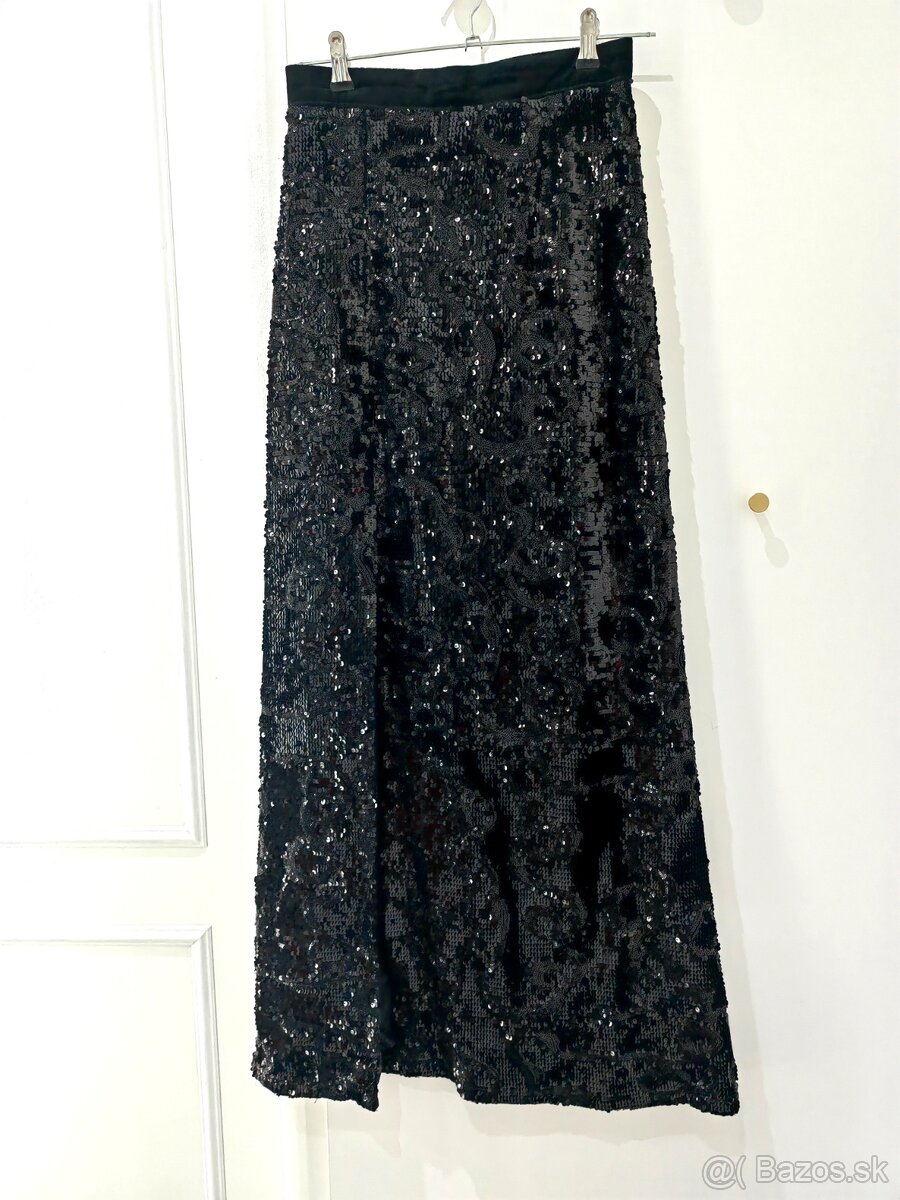 Sukňa je podšita ma dlhý rozparok na pravej nohe ktorý vedie hore k stehnu.