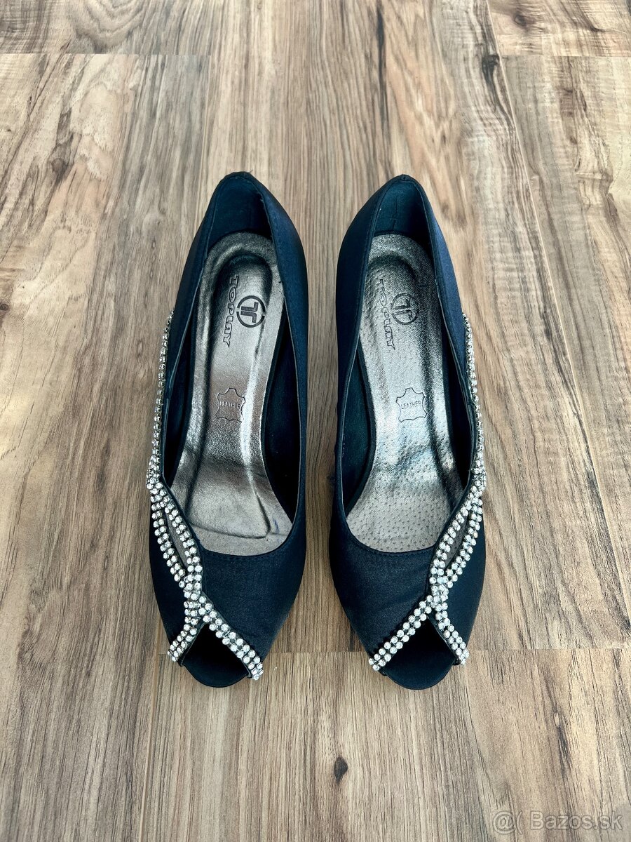 Čierne lodičky s otvorenou špičkou. Sú z čierneho saténu, doplnené o štrasové kamienky pozdĺž topánok a aj na opätku. Obuté boli len raz. Veľkosť 37.