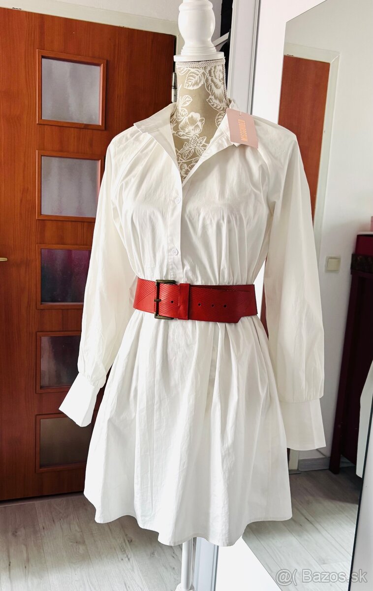 Košeľové šaty Zara veľkosť M - [25.2. 2026]Predám nové biele originál šaty značky Zara, zapínanie gombíky, široké manžety, vpredu vrecká. Bez poškodenia samozrejme. Voľný strih. Rozmery: dĺžka vpredu 120cm vzadu 130cm, šírka cez prsia 68cm, rukáv 52cm. Opakujem ide o voľný oversize strih, dajú sa nosiť ako šaty aj s opaskom aj bez, (opasok k ...