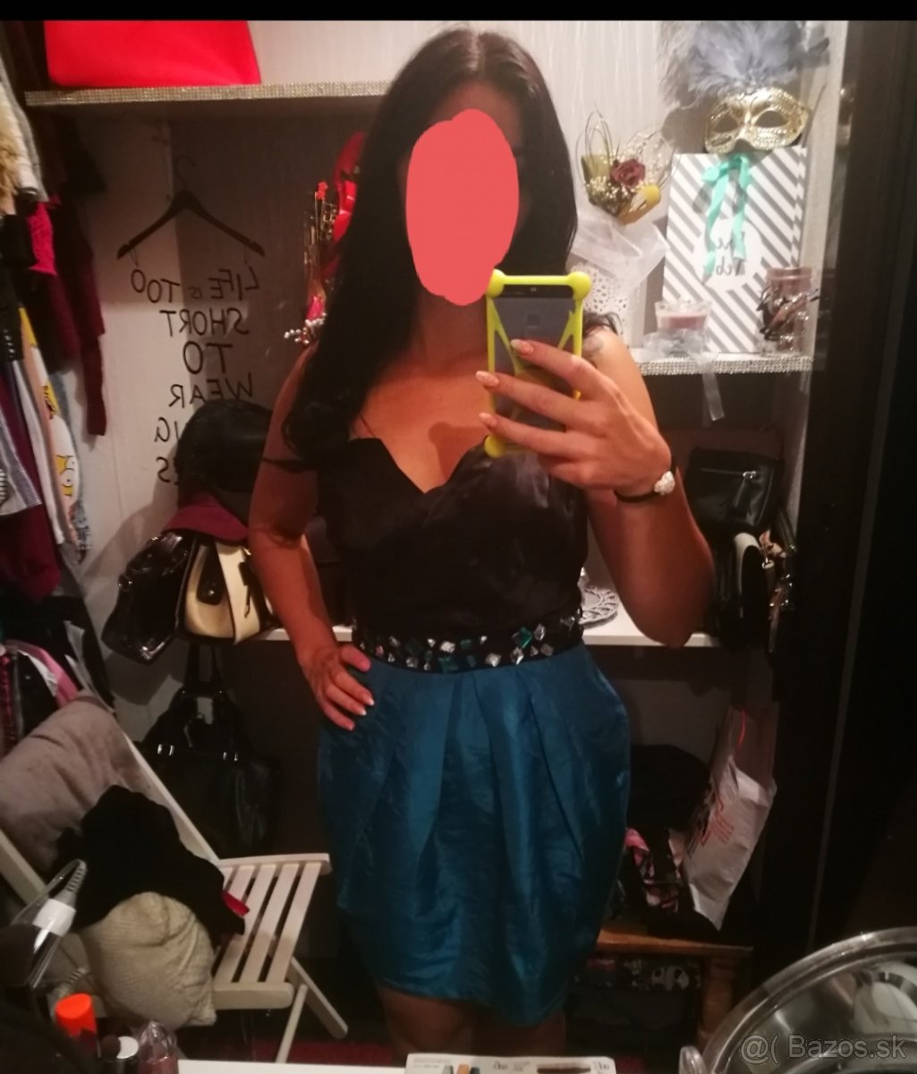 predam tieto spoločenské šaty, veľkosť sko, vrch čierny spodok taky zelenomodry tyrkysovy/petrolejovy, leskly material, su vyzdobene kamienkami