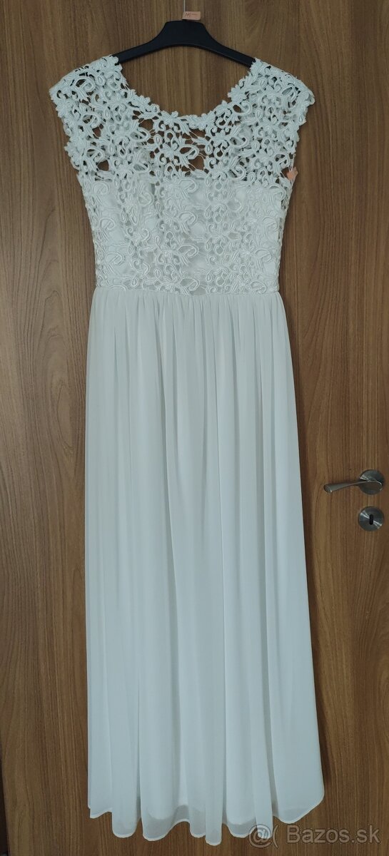 Svadobné, príp. popolnočné šaty z dielne slovenskej dizajnérky Dyony. Sú ľahké a veľmi pohodlné. Šité na mieru, pekne sedia na postavu 36/S, moja výška je 166 cm, mala som balerínky, neboli mi úplne po zem. Rozmery sú aj na fotkách. Zapínanie je vzadu na zips.