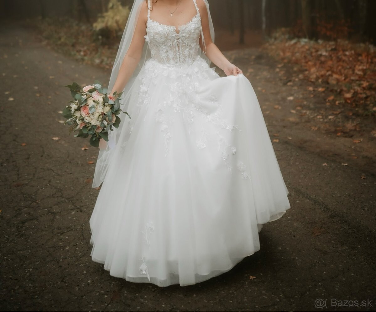 Predám svadobné šaty. Šaty sú bielej farby. Sú jemne zdobené kvetinami a maju viazanie na korzet a aj na zips. Veľkosť šiat 36. Šaty sú vhodné na výšku 160 cm + 6-7 cm opätok. Predávam aj kruh a taktiež závoj v bielej farbe. Dohoda možná. Osobný odber okres Bardejov. Šaty boli profesionálne vyčistené. Pôvodná cena 1000€. Predávam za 300€ spolu s kruhom, závojom a obalom na šaty. A aj dve biele kožušteky v cene, veľkosť XS a M alebo osobitne za 15€/ks. Pripadne sa viem aj dohodnúť na cene.