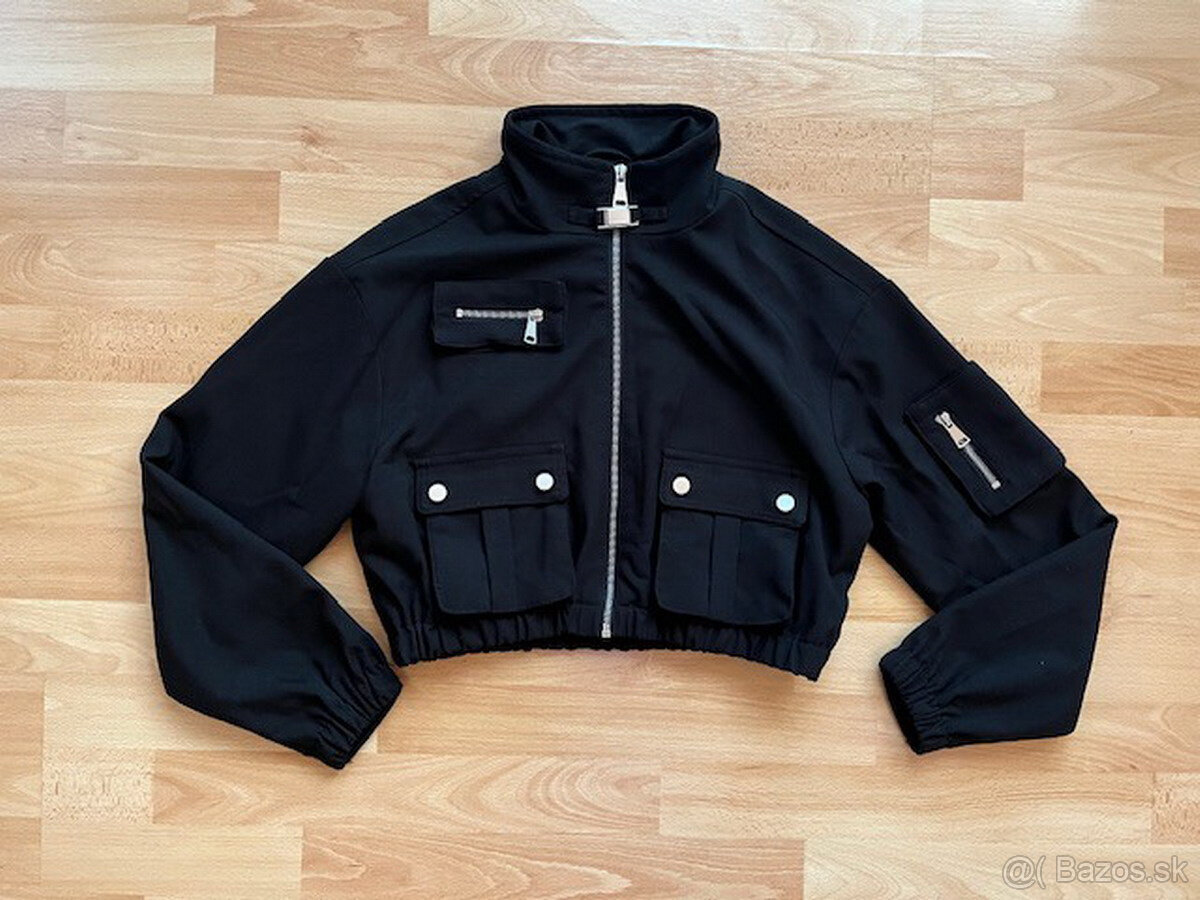 Prechodná croptop bunda v čiernej farbe značky FB Sister (New Yorker), veľkosť je uvedená XS, má stojatý golier, je ľahko podšitá, zapínanie na zips - materiál: vrchná látka: 82% polyester, 16% viskóza, 2% elastan, podšívka: 100% polyester