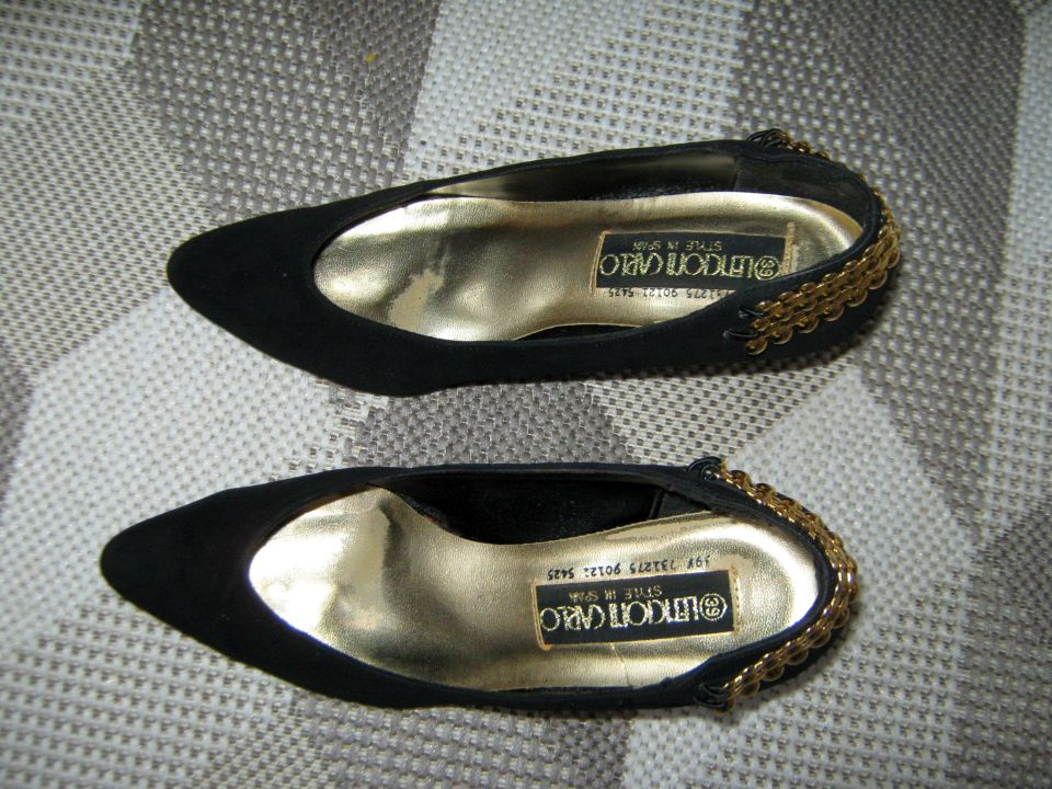 Predám veľmi zachovalé, elegantné, dámske čierne semišové lodičky č. 39, vzadu s efektnou zlatou ozdobou. Výška podpätku 8cm. PROSÍM, NA SMS NEODPOVEDÁM.