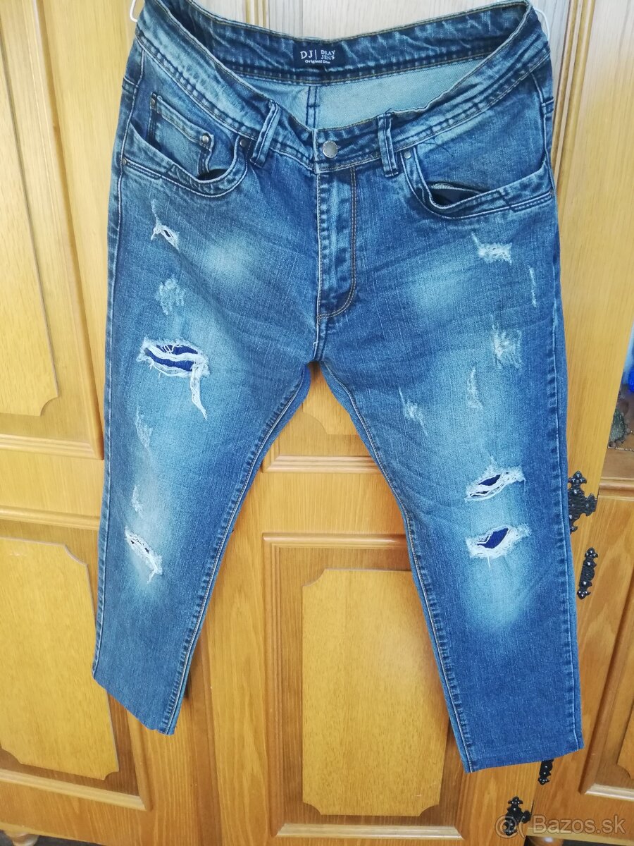 Predám pánske otrhane rifle znacka Displaj, farba tmavo modrá, nosené zachovale bez poskodenia velkost L šírka pasu 45x2 dĺžka vonkajšia strana 95cm